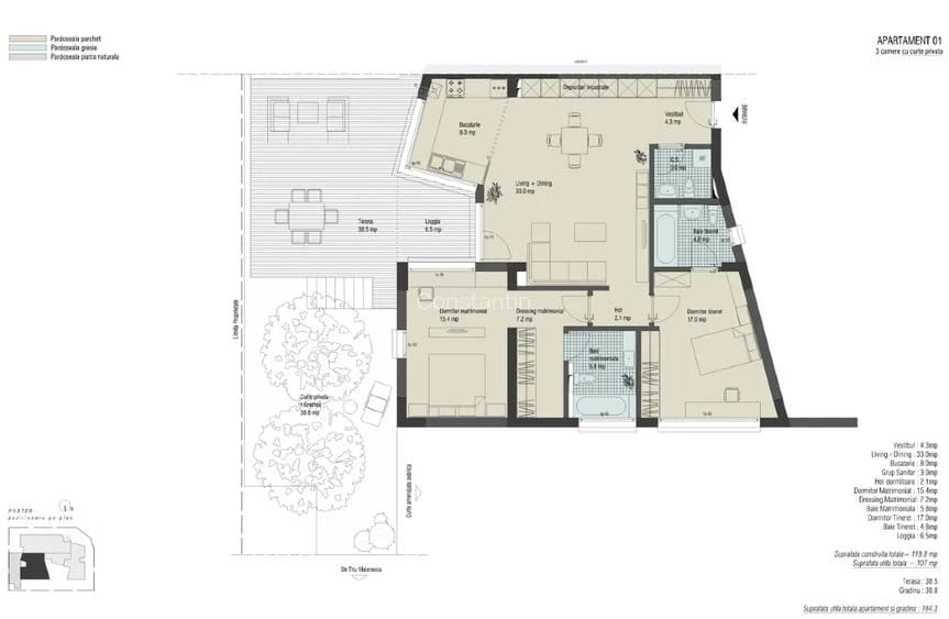Pipera, parter, cu gradina proprie, 2 grupuri sanitare, centrala proprie, mobilat modern, parcare subsol, Su+gradina 170 mp, lift, langa International Chesterfiel College, p+3.