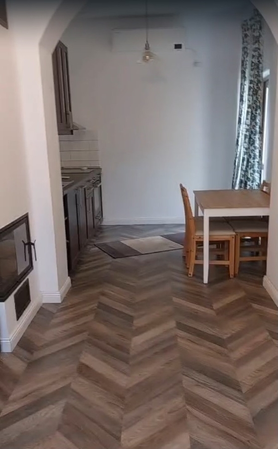 Casa are dormitor, living cu bucatarie, este mobilata, utilata, are centrala proprie, camere inalte, decomandate.