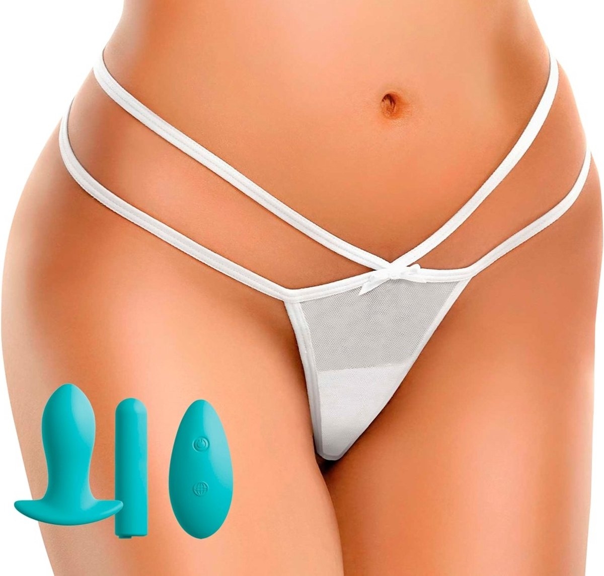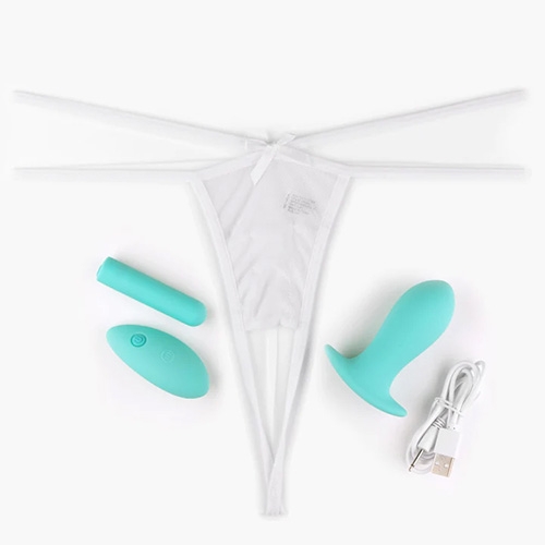 Pachetul contine bikini, butt plug, glont cu vibratii care se poate atasa lenjeriei sau butt plug ului, telecomanda wireless, incarcare USB.