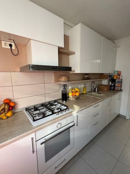Mobila de bucatarie este din MDF. Plita electrica si cuptor pe gaze Gorenje. Hota incorporabila Beko. Frigider Gorenje. Baterie Grohe.