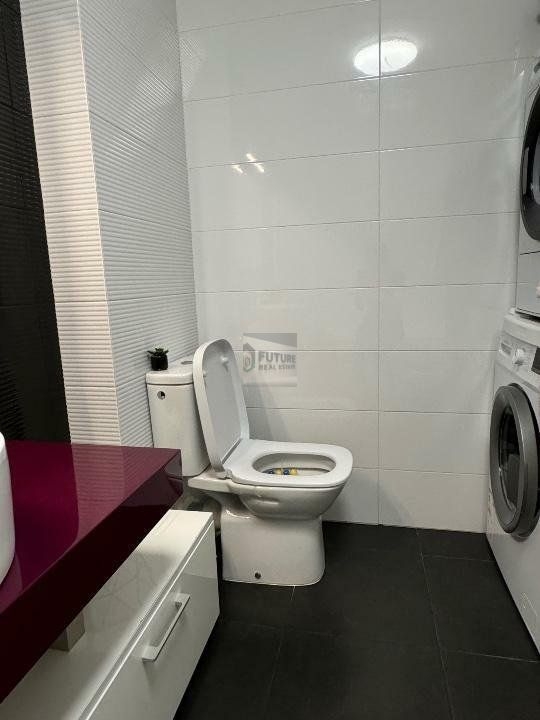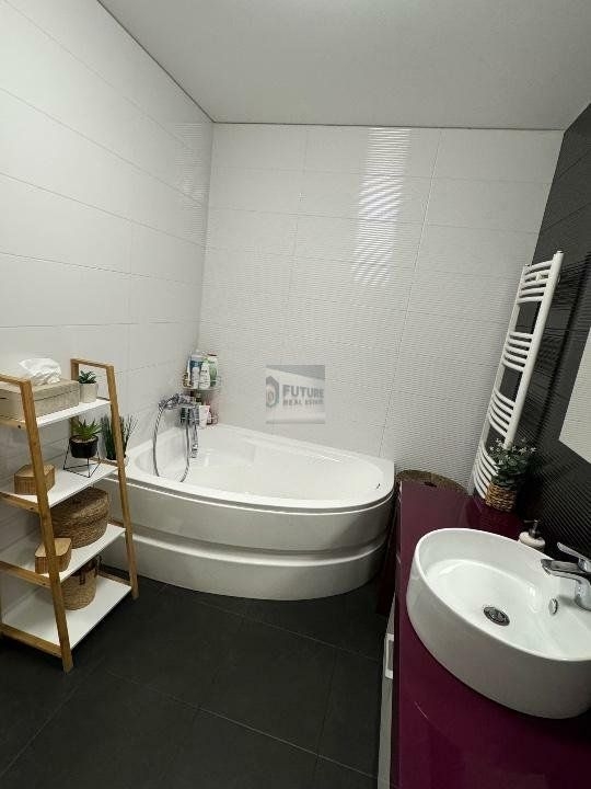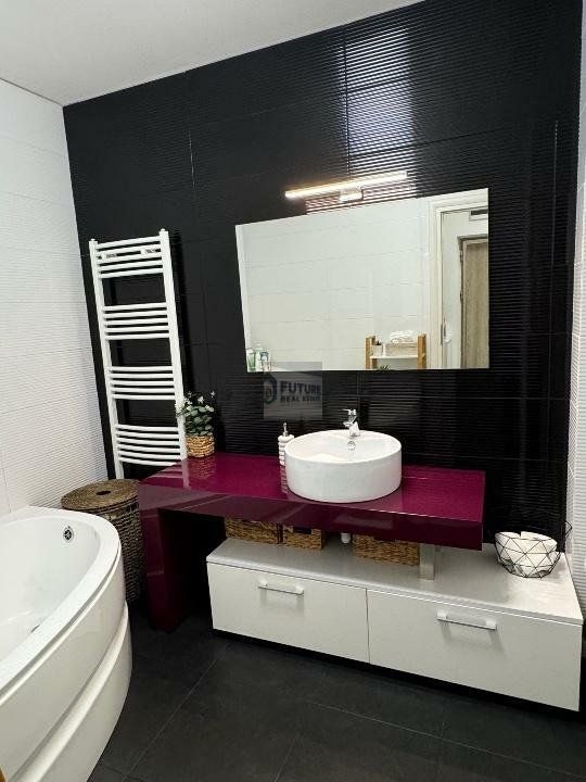 Mobila din baie este din MDF. Vas de toaleta si rezervor Roca. Baterie lavoar si cada Hansgrohe.