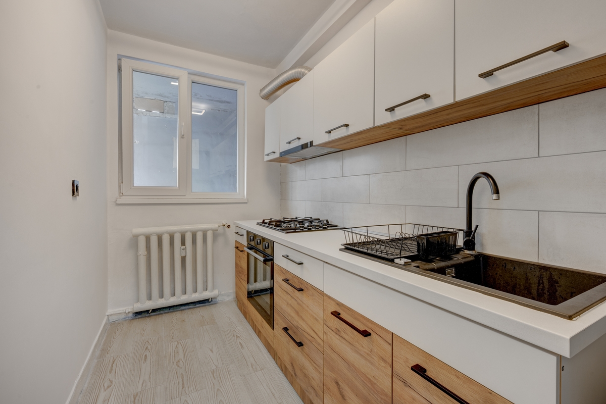 Bucatarie mobilata si utilata (plita pe gaz, cuptor, hota, frigider)