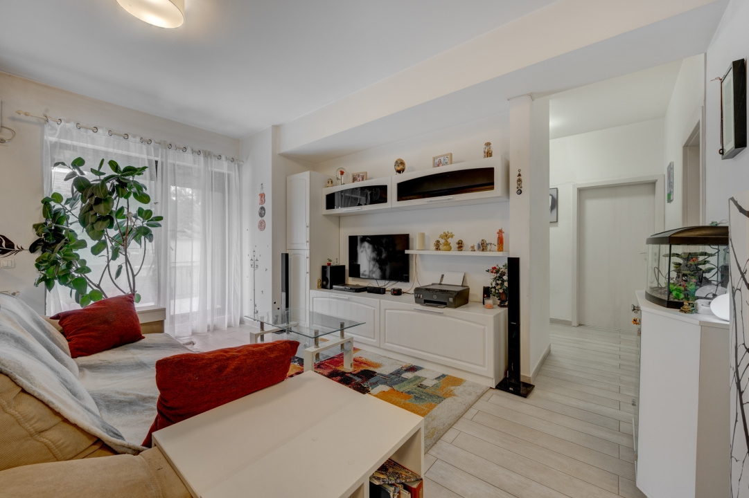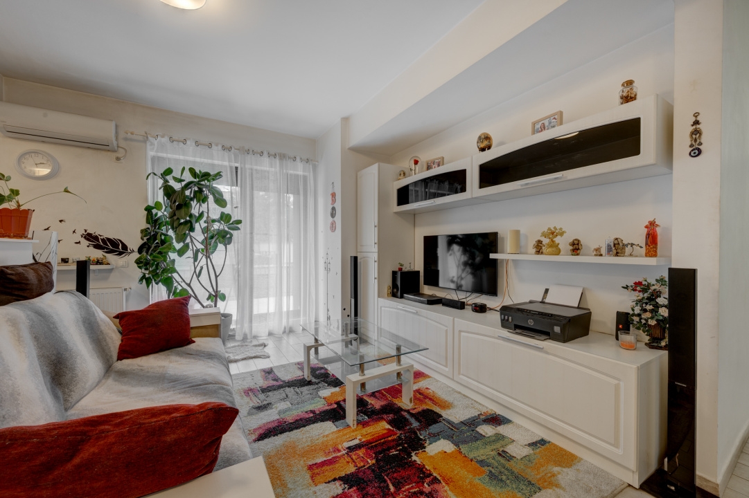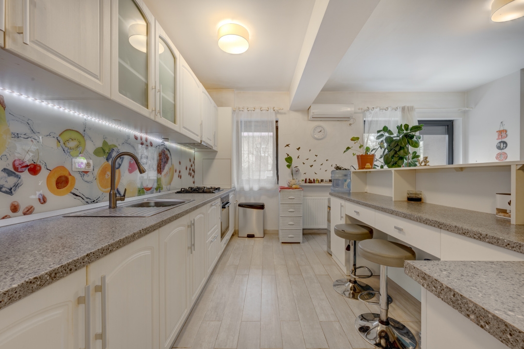 Compartimentarea este practica, aerisita si beneficiaza si de spatii pentru depozitare. La intrare regasim un hol, o debara spatioasa si zona de zi in suprafata de 36 mp formata din living si bucatarie deschisa. Din zona de zi se face accesul catre terasa si gradina. Bucataria este mobilata si utilata si este delimitata de zona de zi printr-o insula inalta in care s-au amenajat si spatii pentru depozitare si zona de servit masa.