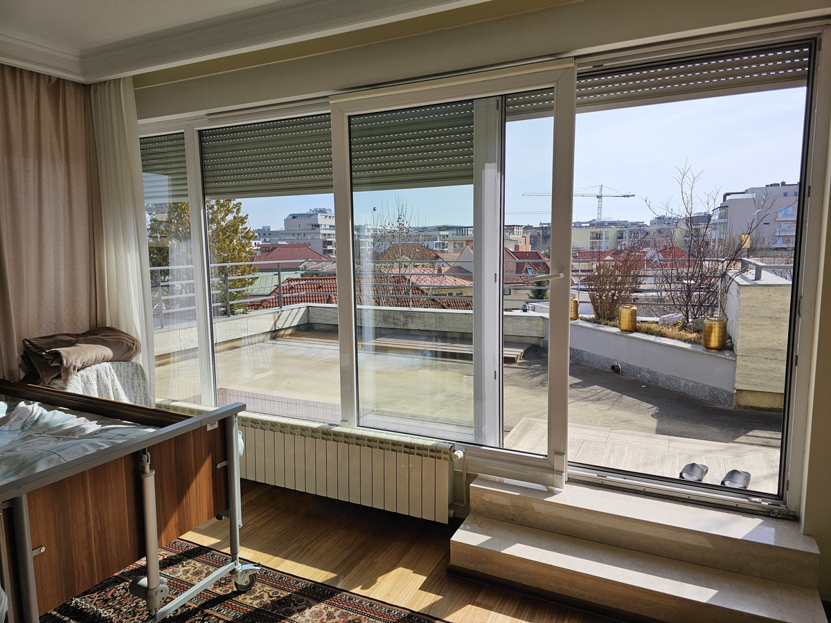 Terasa mare are acces din living, terasa mica are acces din dormitorul mare. Amandoua au vedere libera, neobturata de cladiri. Geamuri mari, foarte luminos.