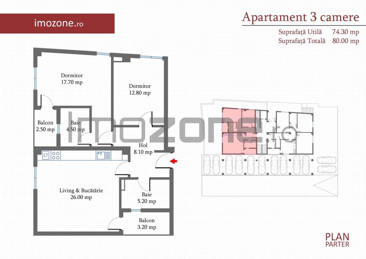 Apartament cu 3 camere, decomandat, disponibil la parter inalt, cu suprafata totala de 80 mp distribuita astfel: 2 dormitoare de 13 mp respectiv 17 mp, 2 bai -5mp si 4.5 mp, living+bucatarie de 26 mp si un hol generos de 8 mp in care se poate amenaja mobilier pentru depozitare.