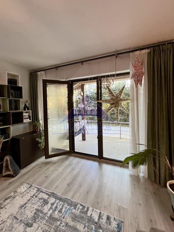 Atat din living cat si din bucatarie se poate iesi pe o terasa acoperita de 21 mp si in curtea amenajata cu gazon si arbori ornamentali, ce reprezinta un spatiu placut pentru petrecerea timpului liber, atat pentru adultii cat si pentru copii.