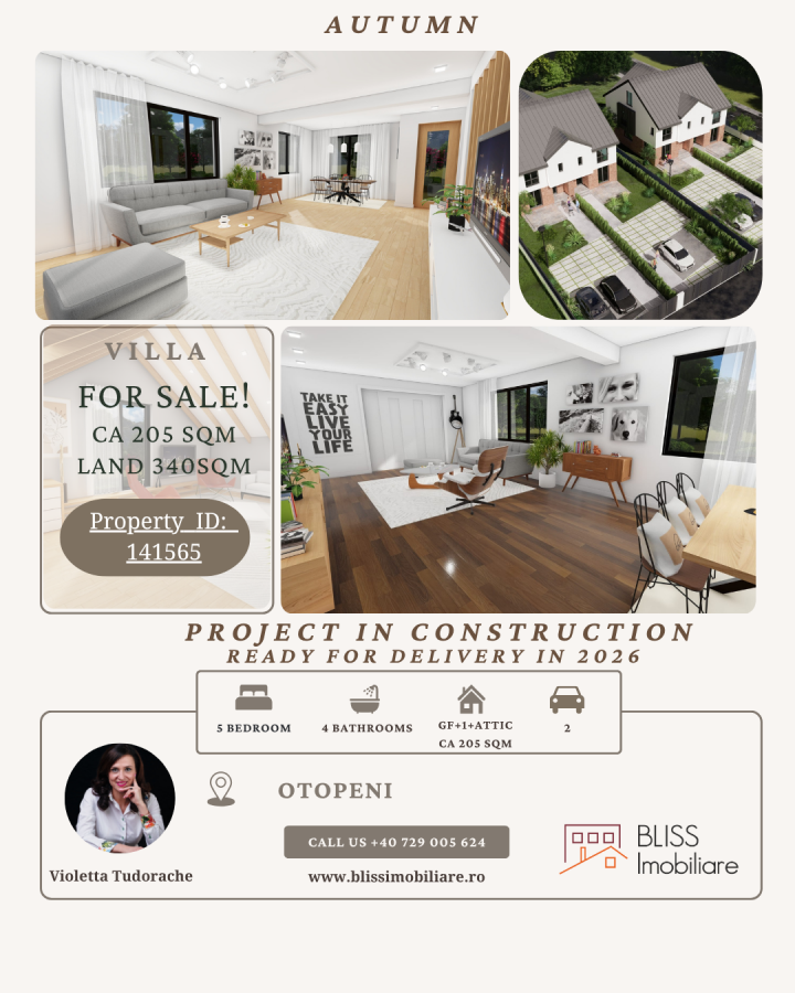 Casa Autumn este o casa duplex cu 6 camere, constructie noua, parte din ansamblul rezidential boutique Briza4Seasons, amplasat intr-o zona rezidentiala linistita din Otopeni, Ilfov, cu acces rapid catre DN1, Aeroportul Henri Coanda, zona 23 August, scoli si centre comerciale.