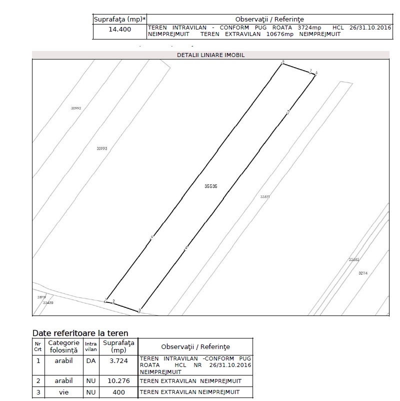 Suprafata 10676mp teren extravilan + 3724mp teren intravilan, la strada asfaltata. Pentru extravilan, exista si un drum de acces agricol in partea opusa celui asfaltat.